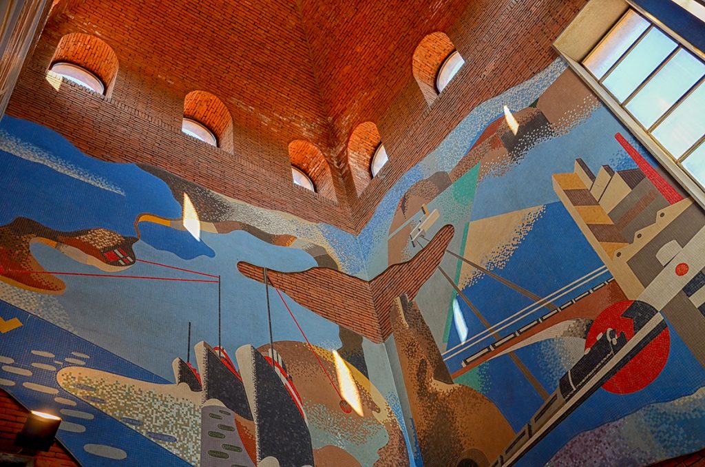 All' interno della torre si trova lo splendido mosaico in ceramica opera degli artisti Fillia e Prampolini, un vero capolavoro del Futurismo sul tema della comunicazione e della velocità, concetti essenziali del movimento stesso e contemporaneamente al centro dei dibattiti e della cultura di inizio secolo circa lo sviluppo tecnologico.